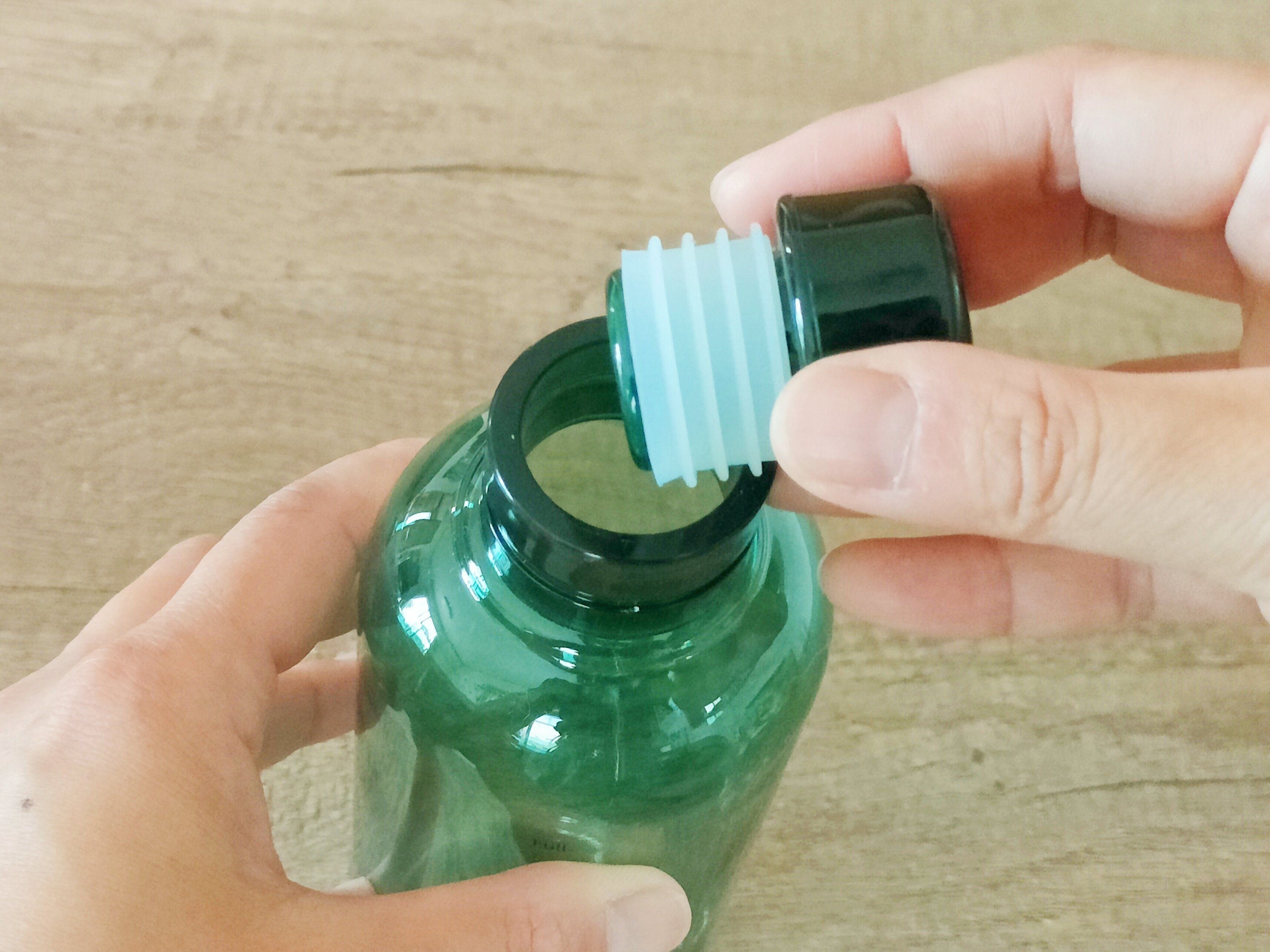 フタを回して閉めるのではなく、シリコーンゴムつきのフタをギュッと押し込むタイプで、水漏れしにくいのです!