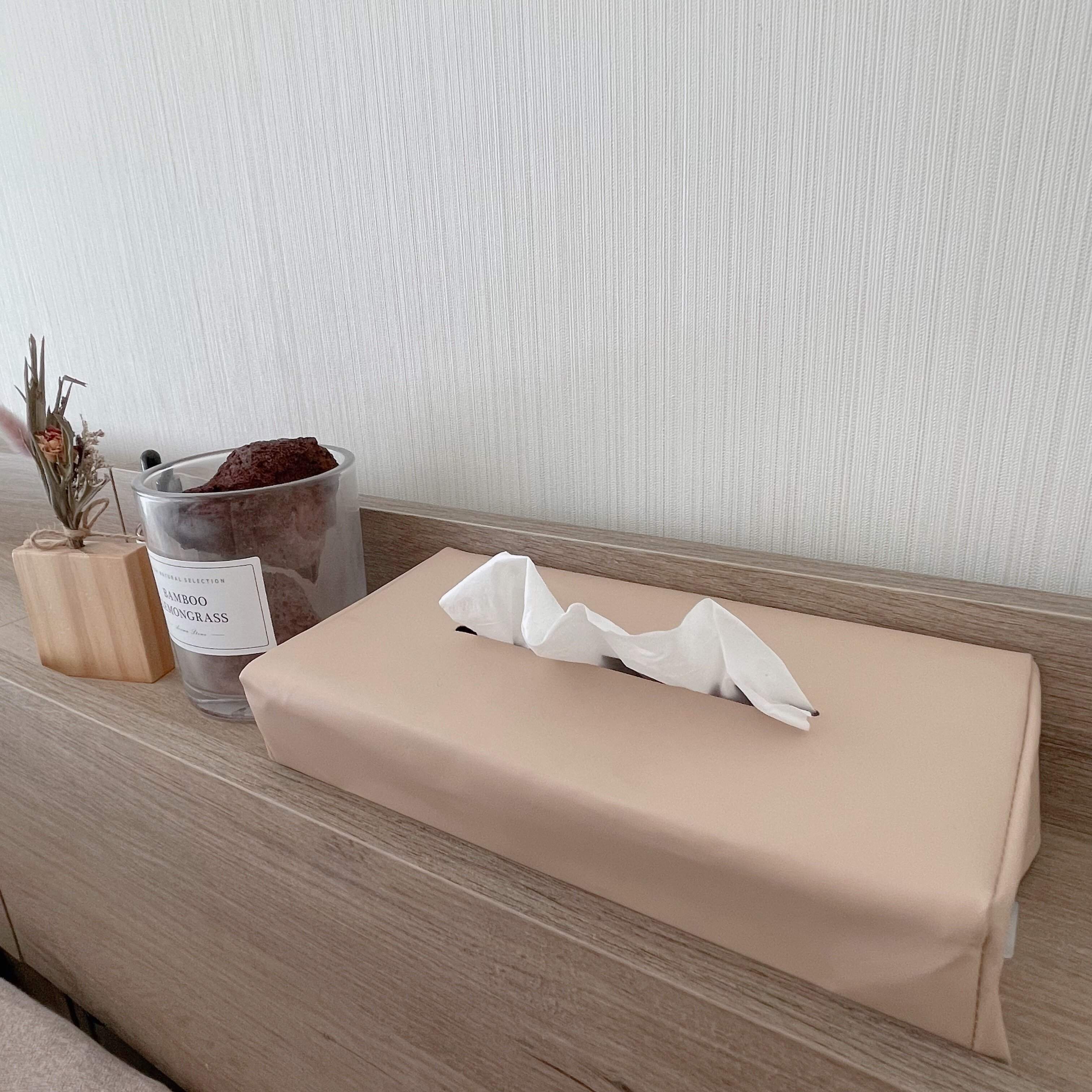 色柄のティッシュボックスに、ベージュのカバーをかぶせただけで、一気にナチュラルテイストのインテリアに仕上がりました。流行りのグレージュ家具との相性が良いので、気軽にトレンドを取り入れられます。