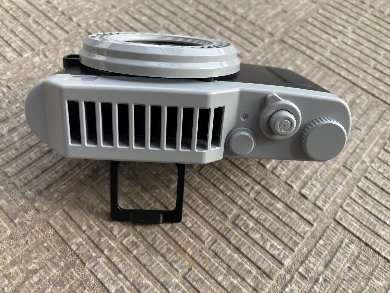 シャッター部分がスイッチになっていて、電源を入れるとカメラ上部から風がでてきます。首からぶら下げると、下から顔に風があたって涼しいです。