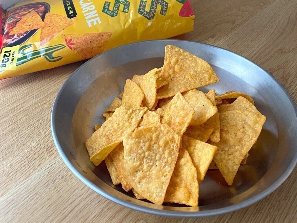 タコスチップスは噛むたびにコーンの味と香ばしさがひろがり、オニオンやポーク、ガーリック、トマトなどの旨味を合わせたチリコンカンシーズニングとよく合っています。ほどよい味つけでシーズニングが主張しすぎず、コーンが主役のスナックという印象。スパイシーさがありながらも辛さはほとんど感じないのでお子さんでも食べられそう。