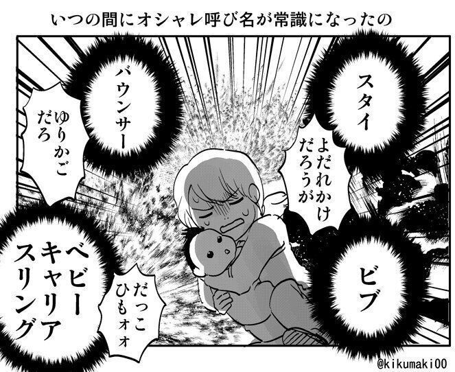 きくまきさん(@kikumaki00)がTwitterで、最近のベビー用品がテーマの育児漫画を紹介したところ、横文字のオシャレな呼び名に「知らなかった」「脳が受けつけない」と驚きの声が寄せられています。作者のきくまきさんにお話を聞きました。
