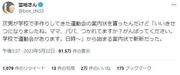 盆地さんさん(@bon_chi33)がTwitterに投稿したのは、息子さんが学校で作成してきた運動会の案内状について。冒頭部分に書かれていたママとパパをねぎらう内容が「かわいくて癒やされる」「爽やかな案内状」と話題になっています。