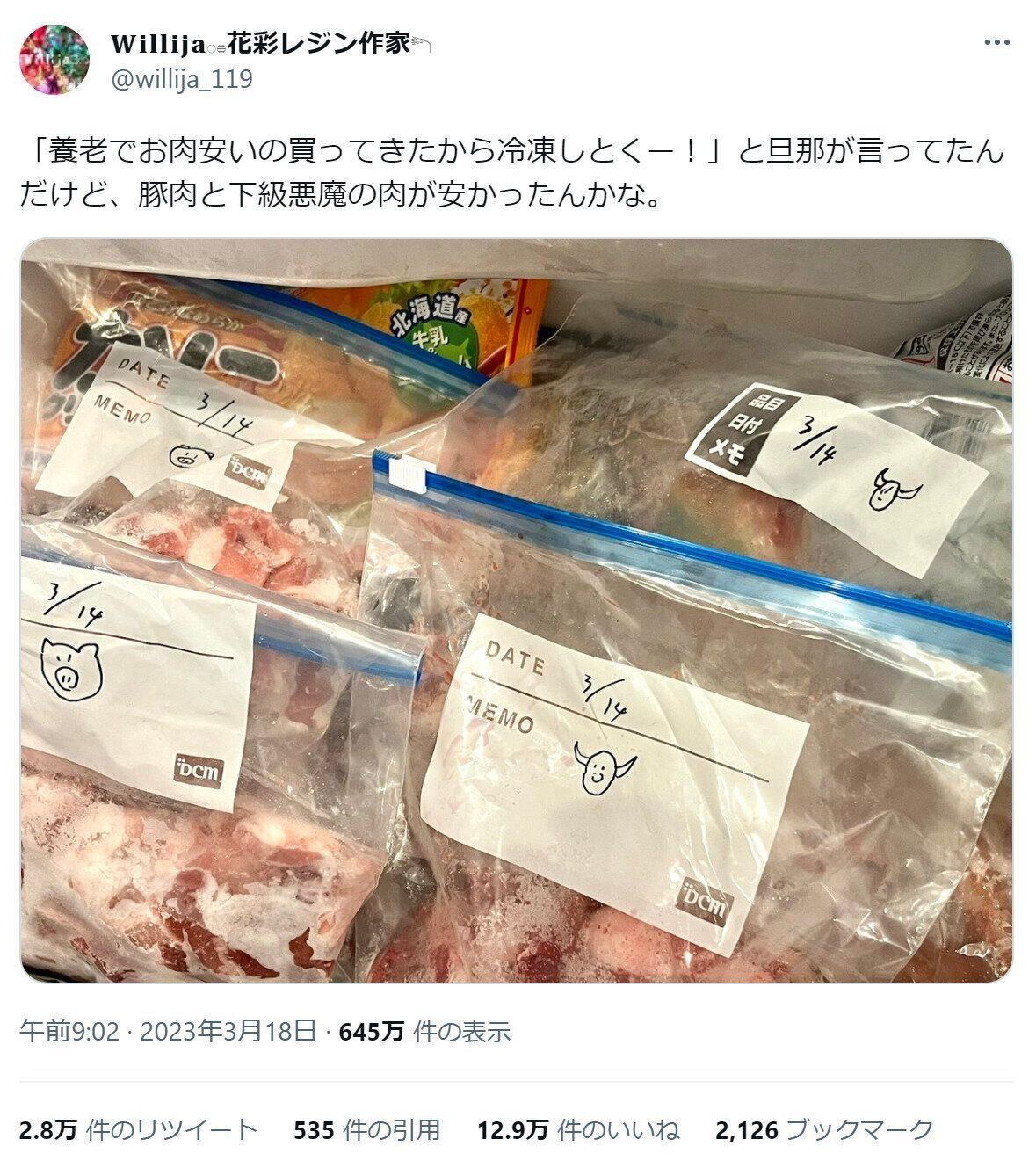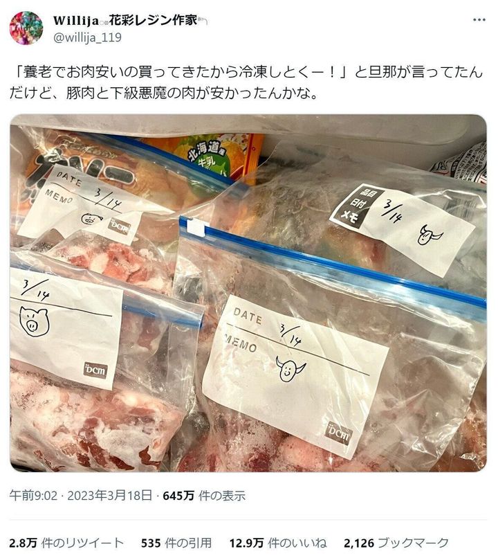 「下級悪魔の肉」という表現に思わず笑ってしまいました。冷凍庫を見たとき、Willija花彩レジン作家さんはどう思われましたか。