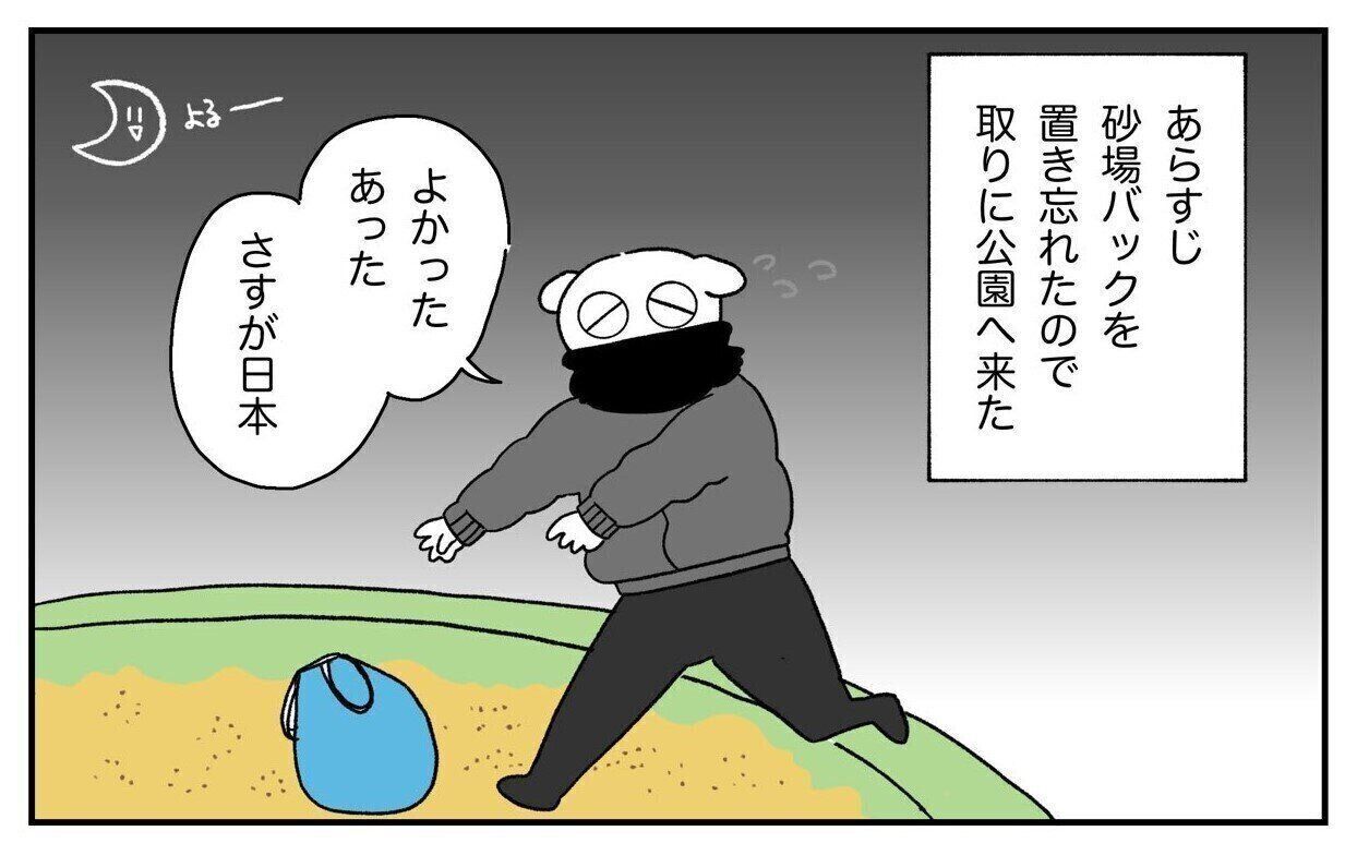 「よかった、あった。さすが日本」と、日本の治安のよさを証明するかのようにバッグは砂場に残されていました。