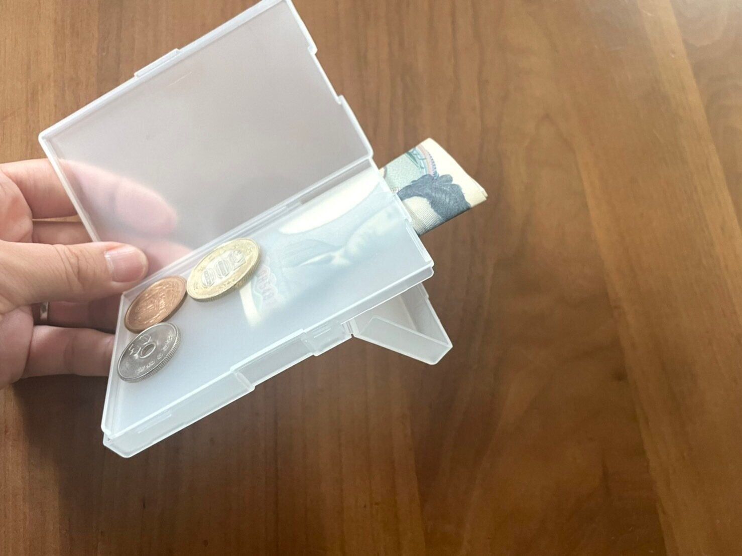 カード以外のものも収納可能です。例えば、お財布自体を持ち運びしたくないときには、簡易的なお財布にもなります。
