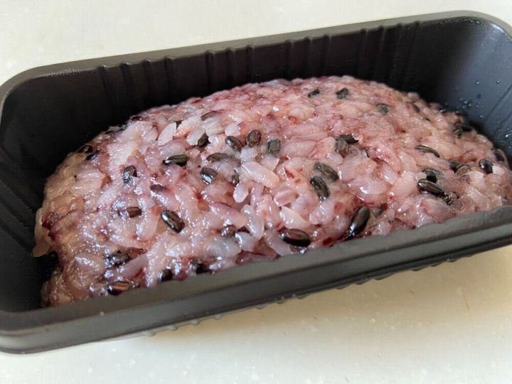 パッケージを開けると、容器に入った赤い色の食べ物が。おにぎりなのにこのビジュアル、まったく味が想像できません。おにぎり、といえば日本の国民食ともいえる昔も今も愛されている和食ですが、見た目はまったく違います。