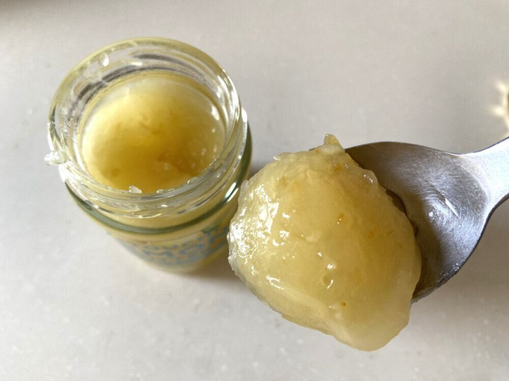 フタを開けるとレモンの爽やかな香りがふわっと広がります。柔らかくスプーンですくうととろりとしています。つぶつぶに見えるのが瀬戸内レモンの果皮です。