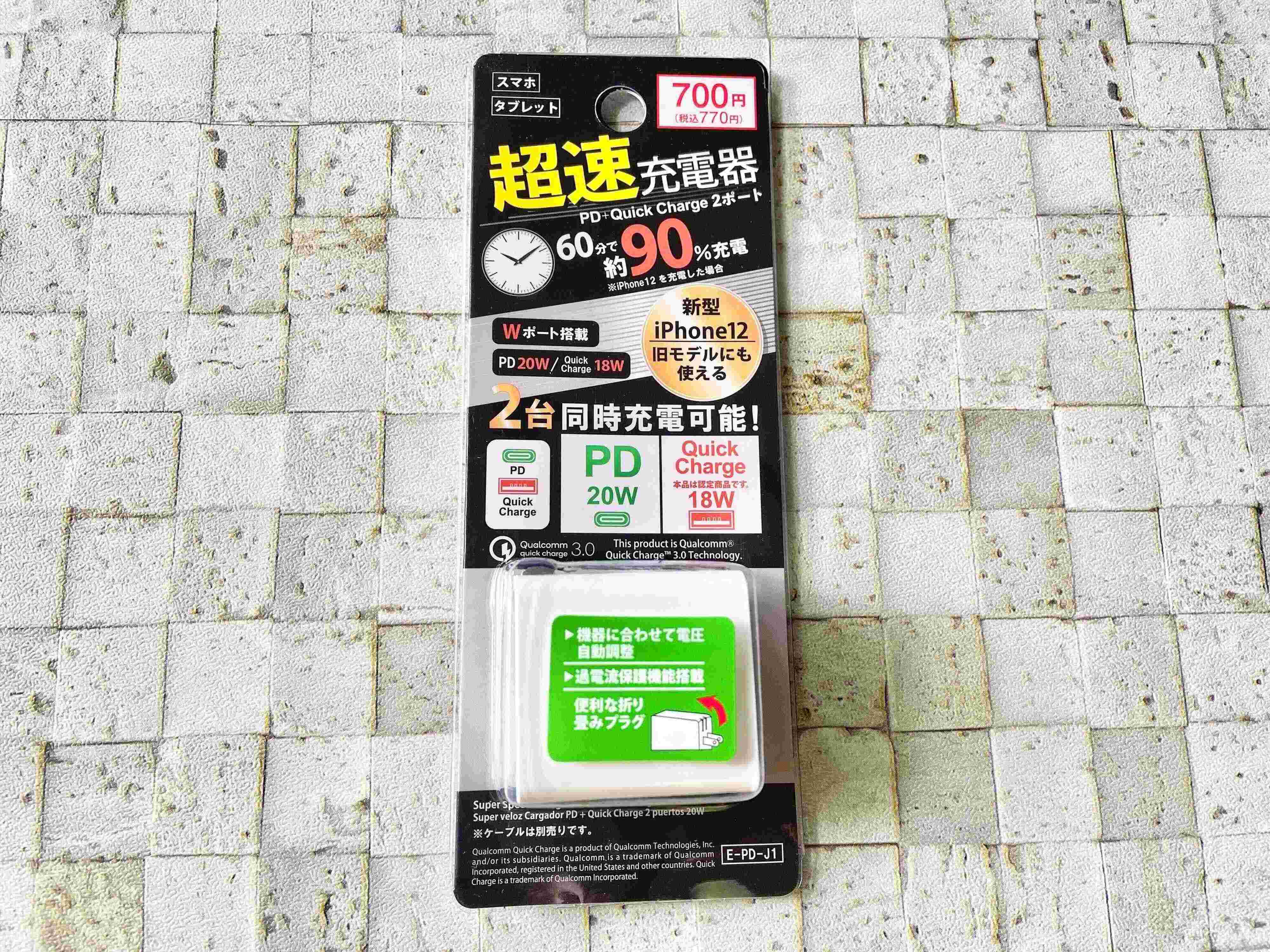 ご紹介するのは、ダイソーで販売されている「超速充電器」です。価格は770円。