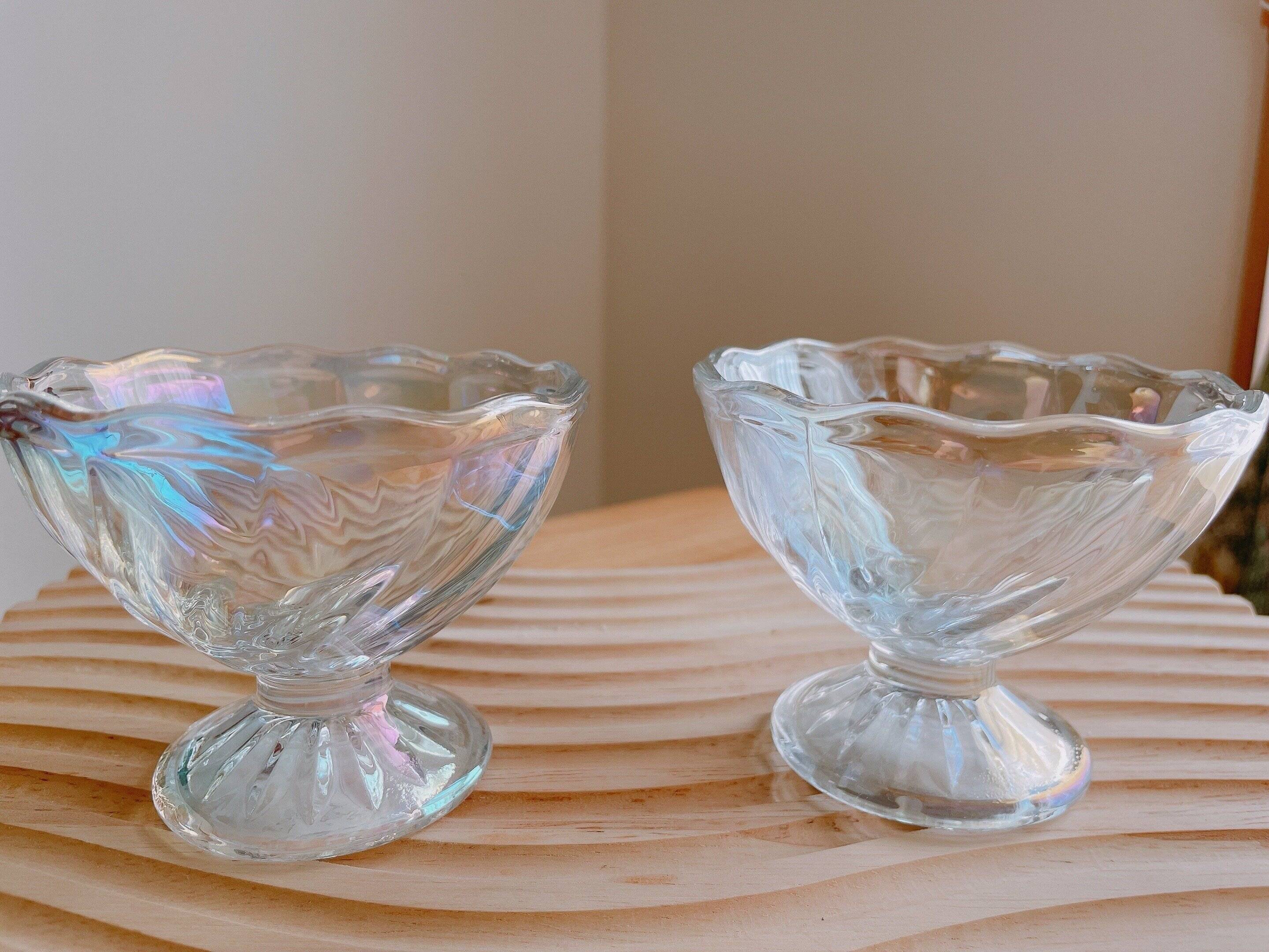 手のひらサイズではありますが、スパイラル状のデザイン、重厚感があり、脚もしっかりしていて、見る場所や角度によって見え方が変わるオーロラの色がとてもきれいなデザートグラスです。