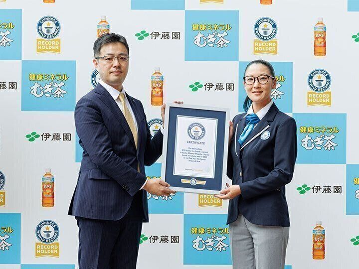 伊藤園の「健康ミネラルむぎ茶」は、麦茶飲料市場において、「最も販売されているRTDむぎ茶ブランド(最新年間販売量)」実績が世界NO.1としてギネス世界記録に認定されました(※1)。6月21日(月)、世界記録公式認定員より認定証の授与が国立競技場(東京都新宿区)で行われました。
