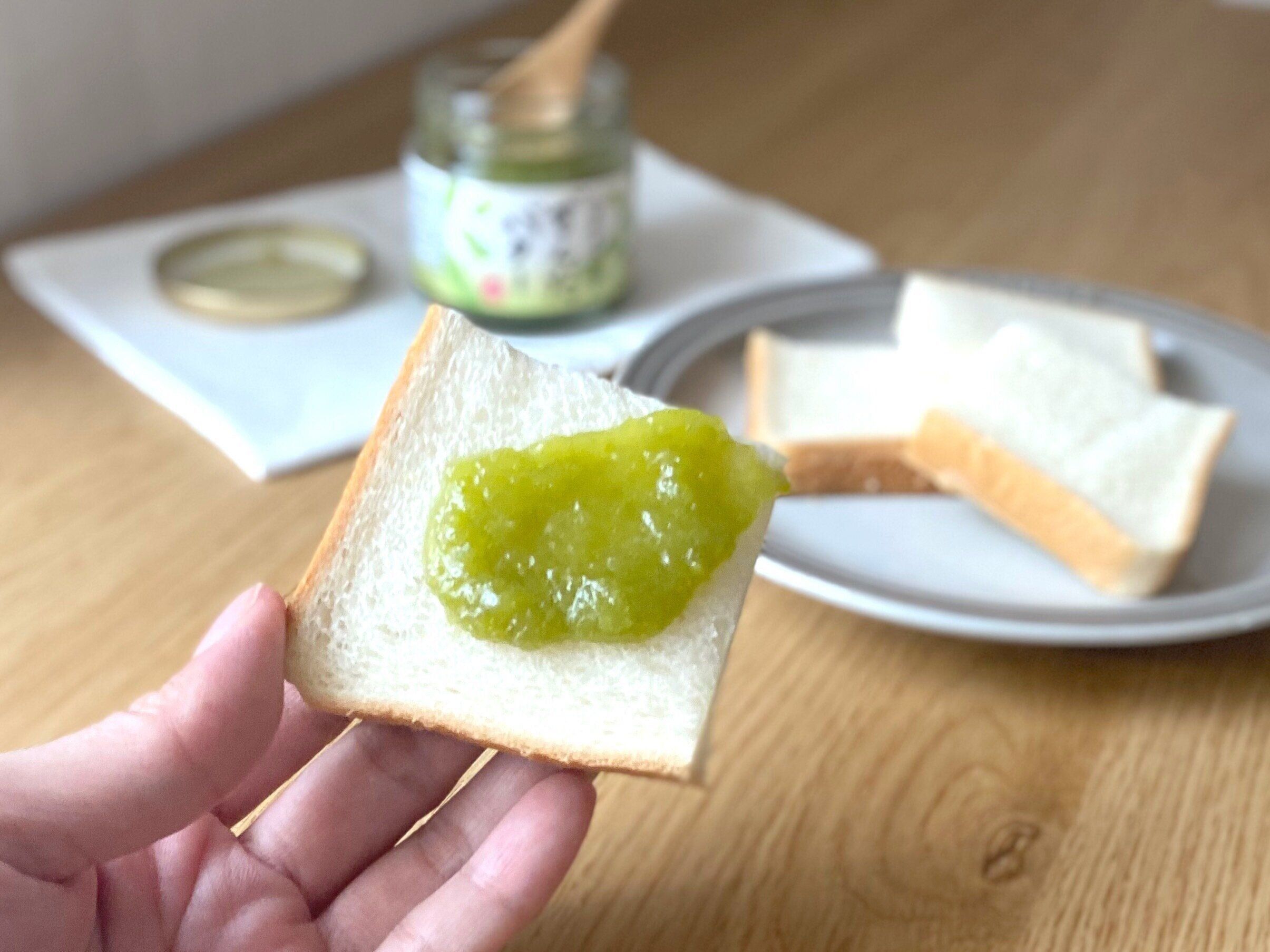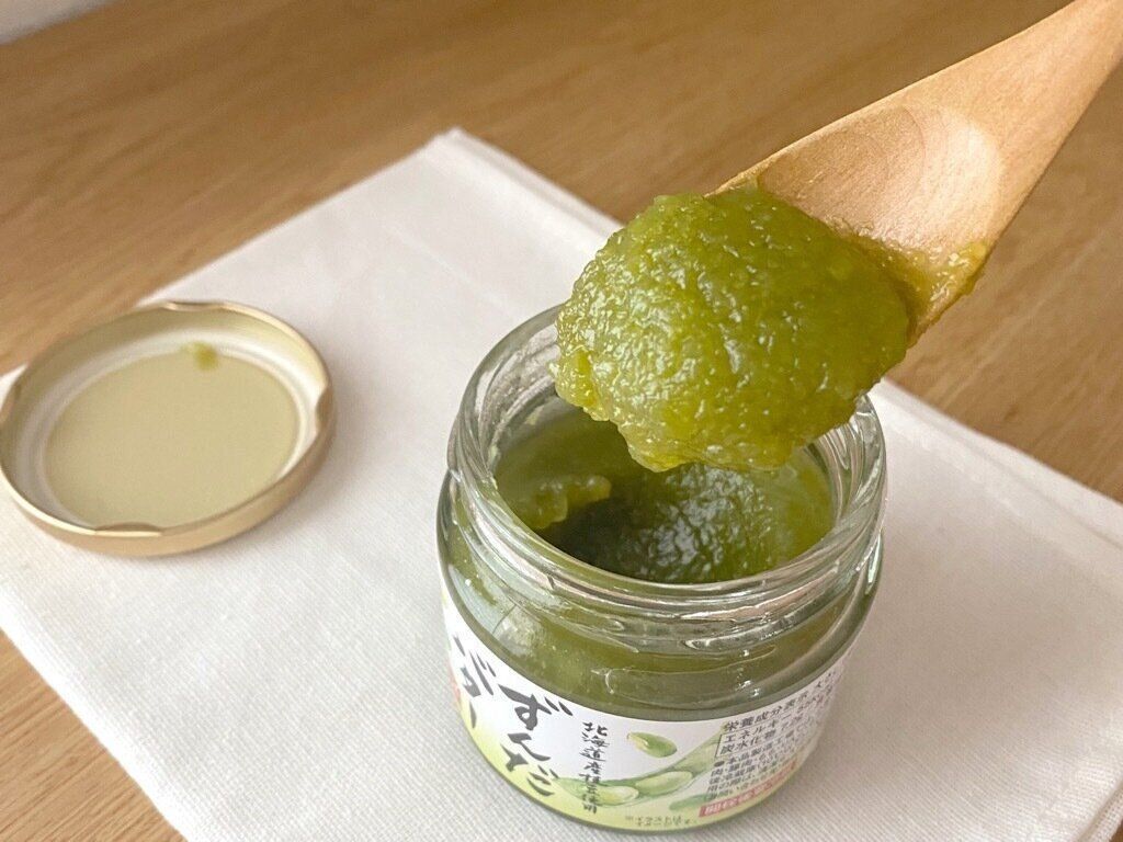 蓋を開けて鼻を近づけてみましたが、枝豆の香りはほんのり香る程度です。すりつぶされた枝豆が入っているのでボッテリとしたテクスチャーでパンに塗りやすい。