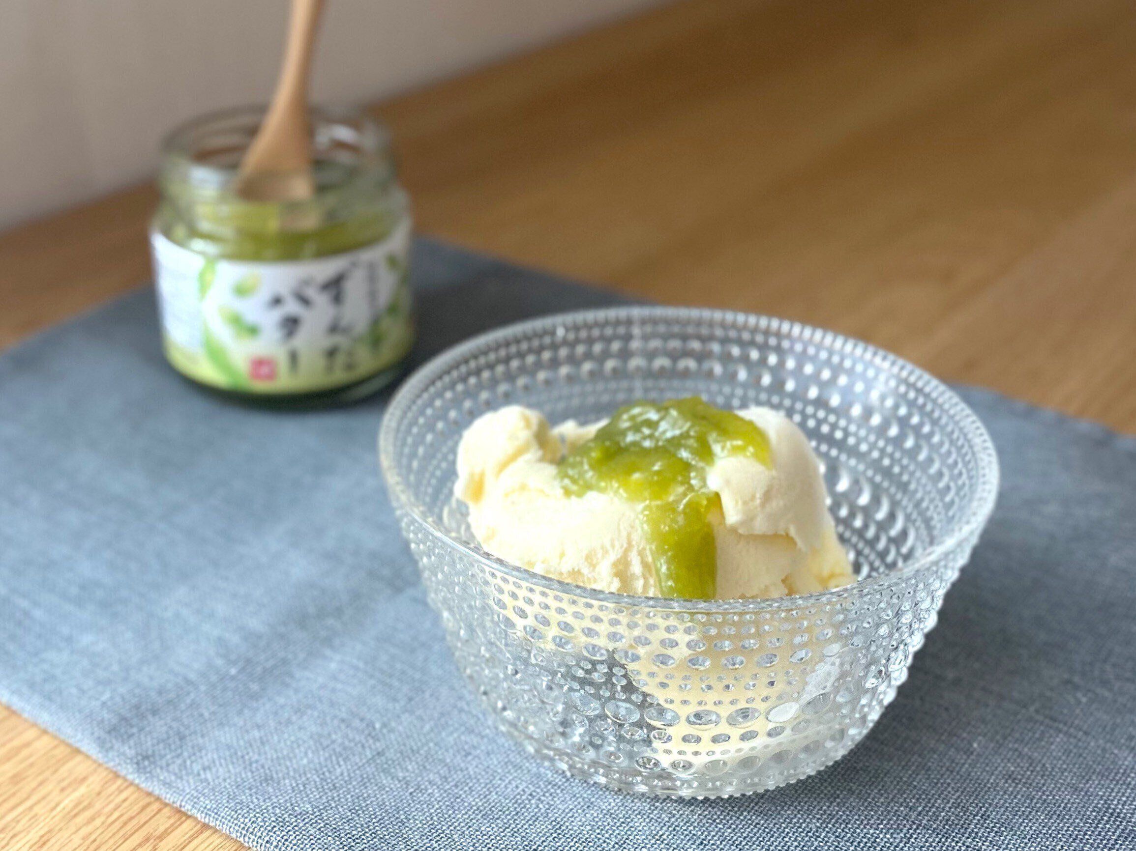 バニラアイスのミルキーさにずんだバターの味わいが加わることで一気に和テイストに。かき氷のトッピングやパンケーキでサンドして、どら焼き風にアレンジしてもおいしそうですね。