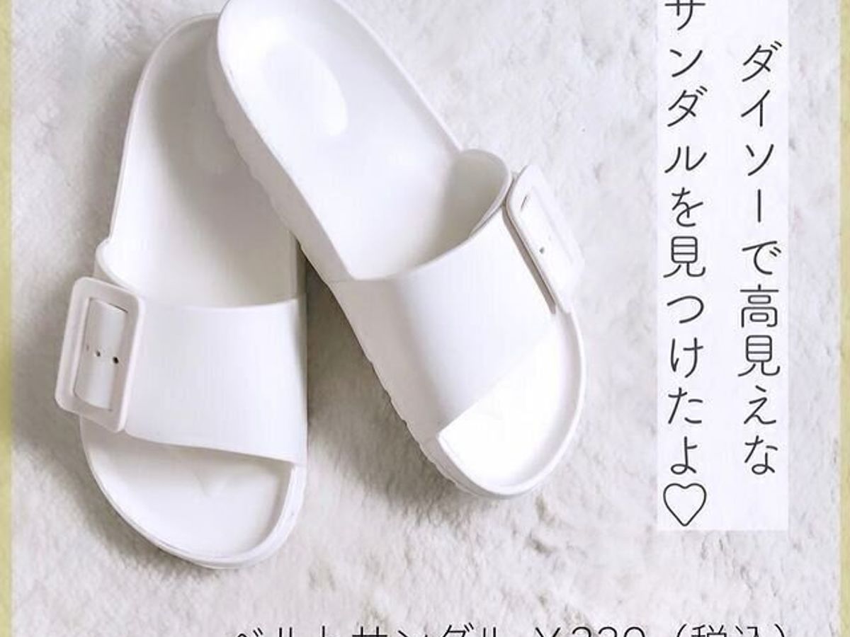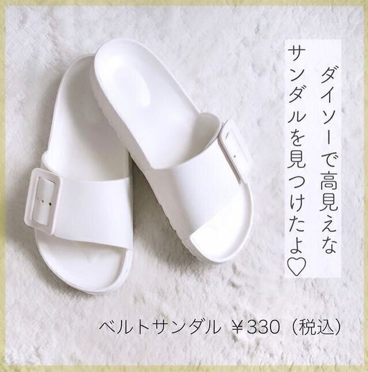 真っ白にシンプルなベルトのデザインがかわいいサンダル。こちらもダイソーで330円で買えちゃいます。カジュアルにもキレイめにも合わせやすいデザインですね!少し厚底になっていて本体も軽く、長く履いても疲れにくそうです。カラーはホワイトのほか、グレーとブラックもありますよ。