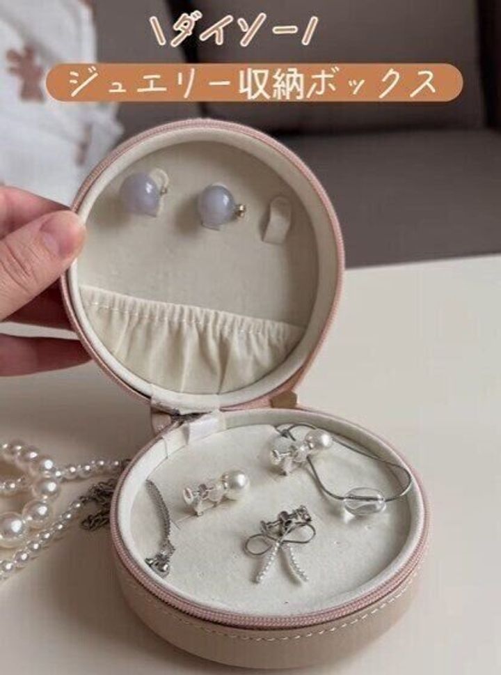 淡くて優しいカラーとコロンとした丸いフォルムのこちらは、ダイソーで買えるジュエリー収納ボックスです。出しっぱなしにしてもかわいいですね。値段はなんと330円!写真のようにしっかり収納できて、持ち運びにも便利です。