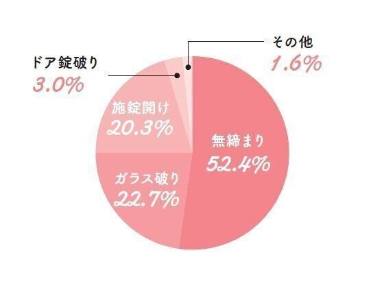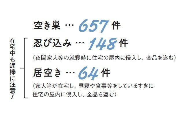 空き巣などの侵入手口で最も多いのが、"無締まり"です。ちょっとそこまでの外出だからドアに鍵をかけない、マンションの上の階だから窓の鍵はかけなくても平気などと考えず、家族全員で戸締まりに気をつけましょう。