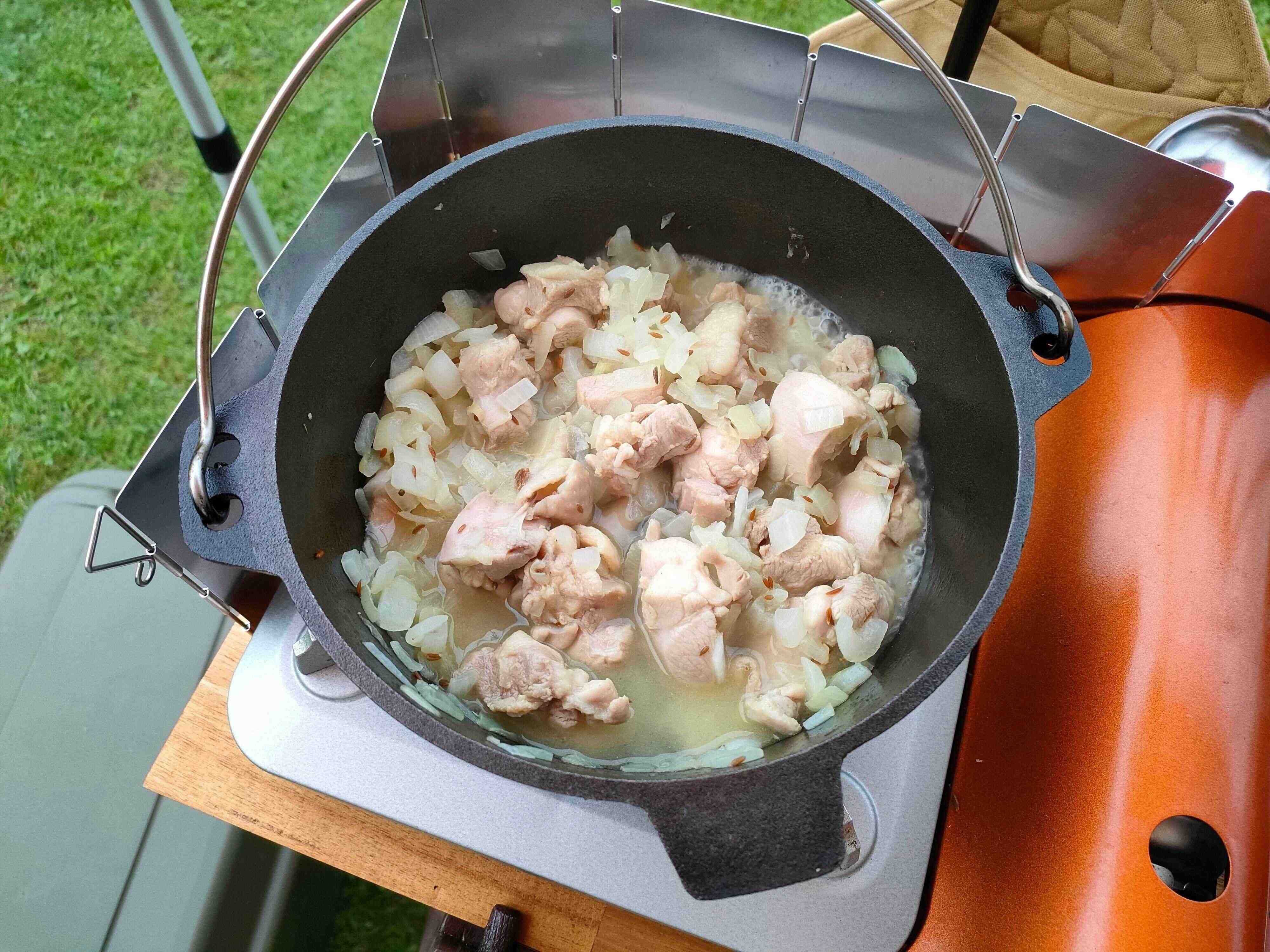 みじん切りにした玉ねぎ1個分と鶏もも肉200gを入れて、しんなりするまで炒めます。