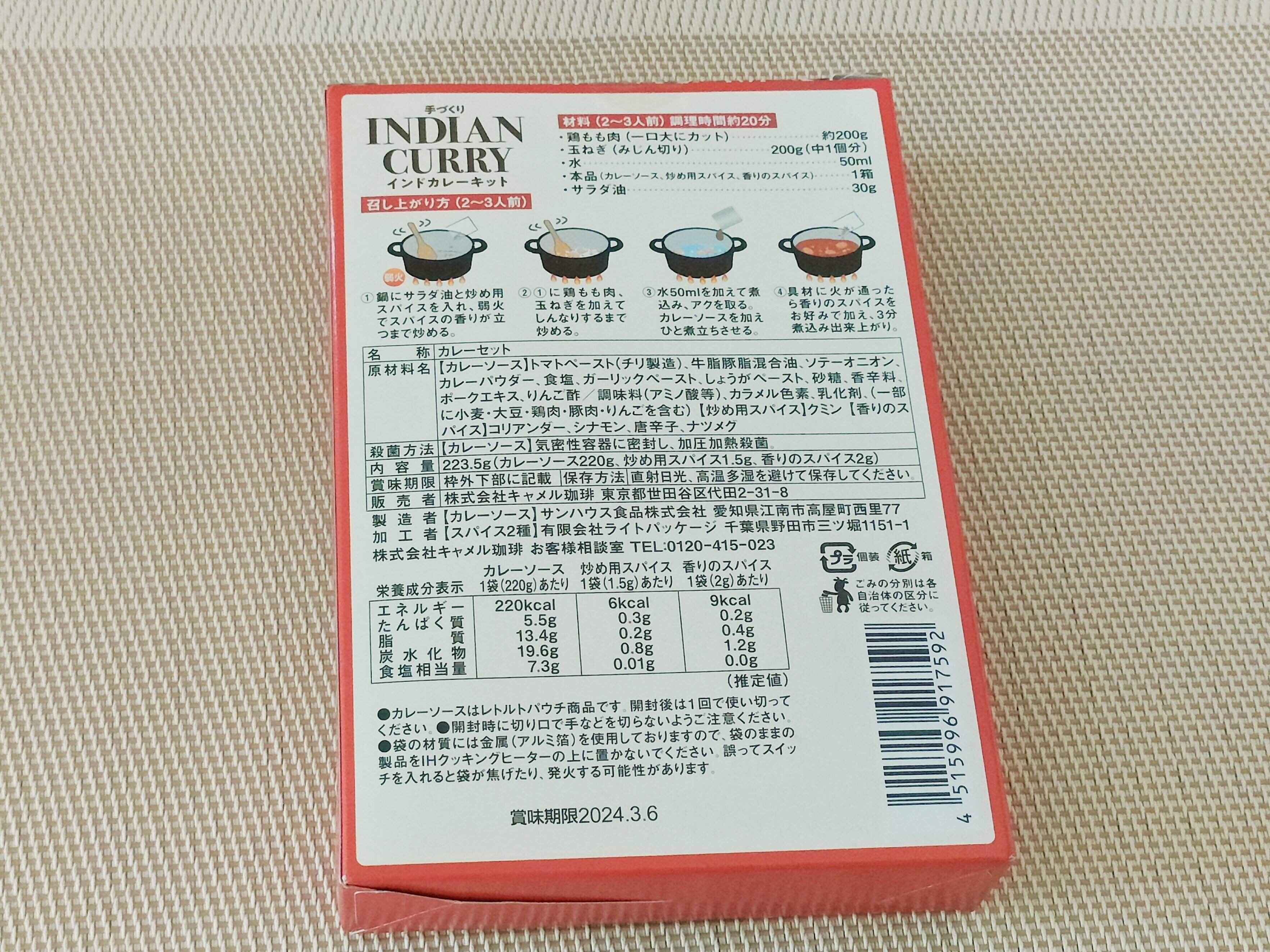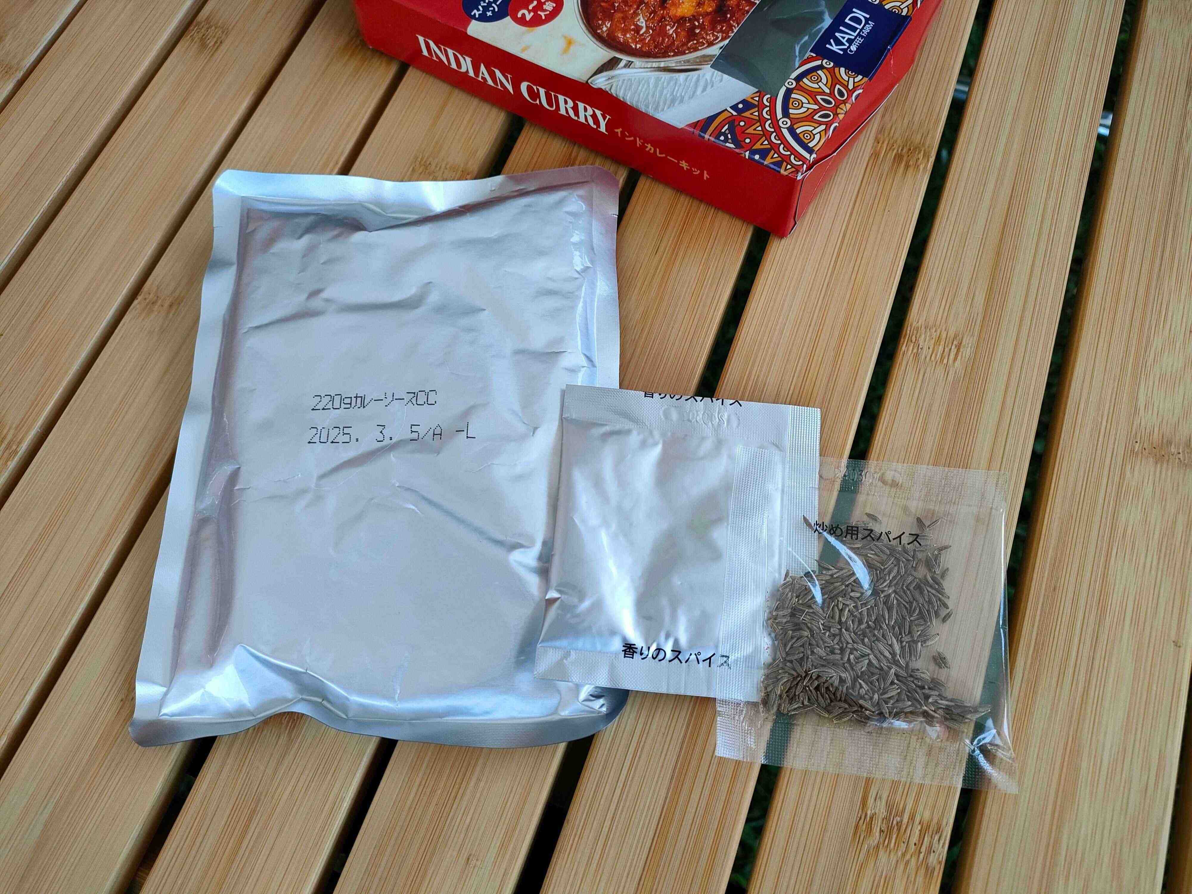 実際に箱から取り出してみると、カレーソースのパウチと炒め用スパイスと香りのスパイスが別袋で入っていました。
