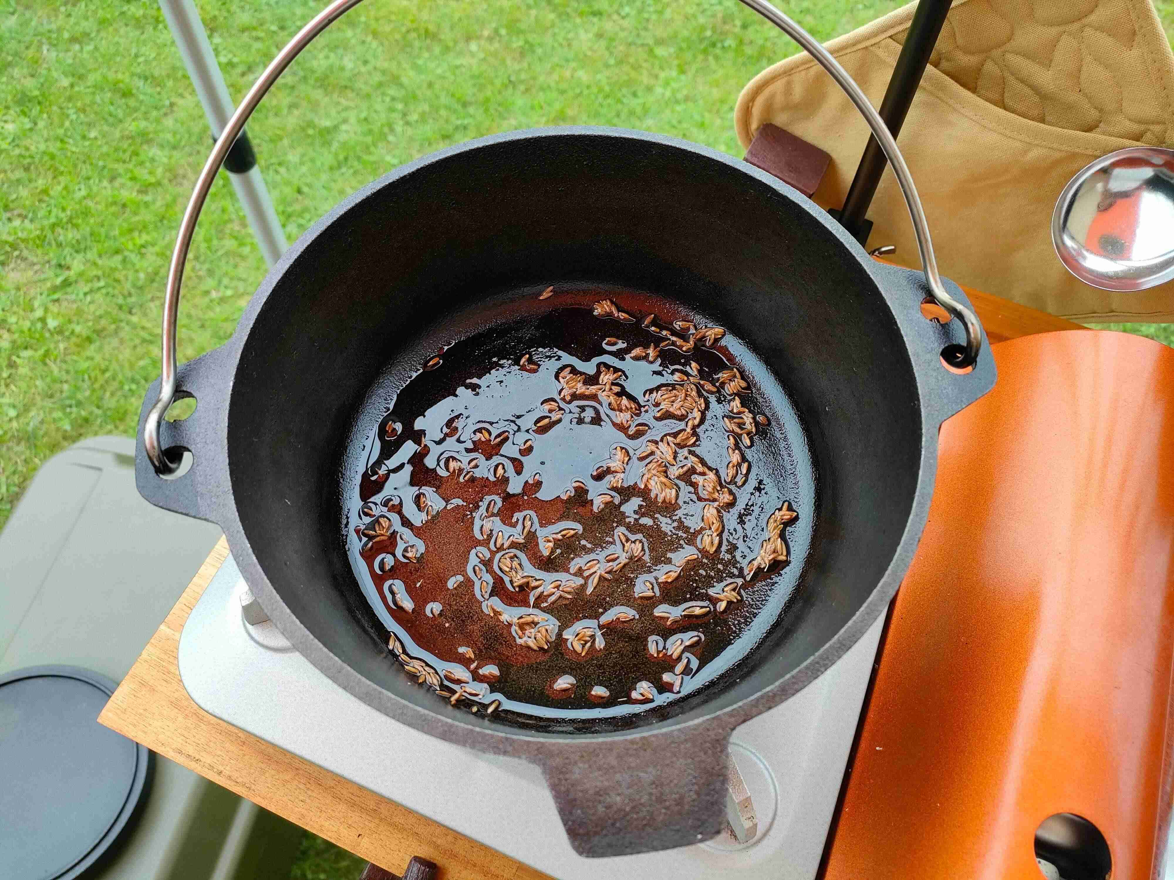 ある程度火がとおってきたら、水を50ml入れて、アクを取り除きます。水も少量なのですぐに沸騰し、ふつふつしてきます。