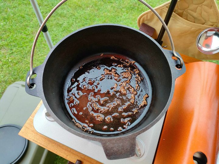 まず、鍋に油と炒めスパイスを入れて、香りがたつまで軽く炒めます。クミンのいい香りが漂います。