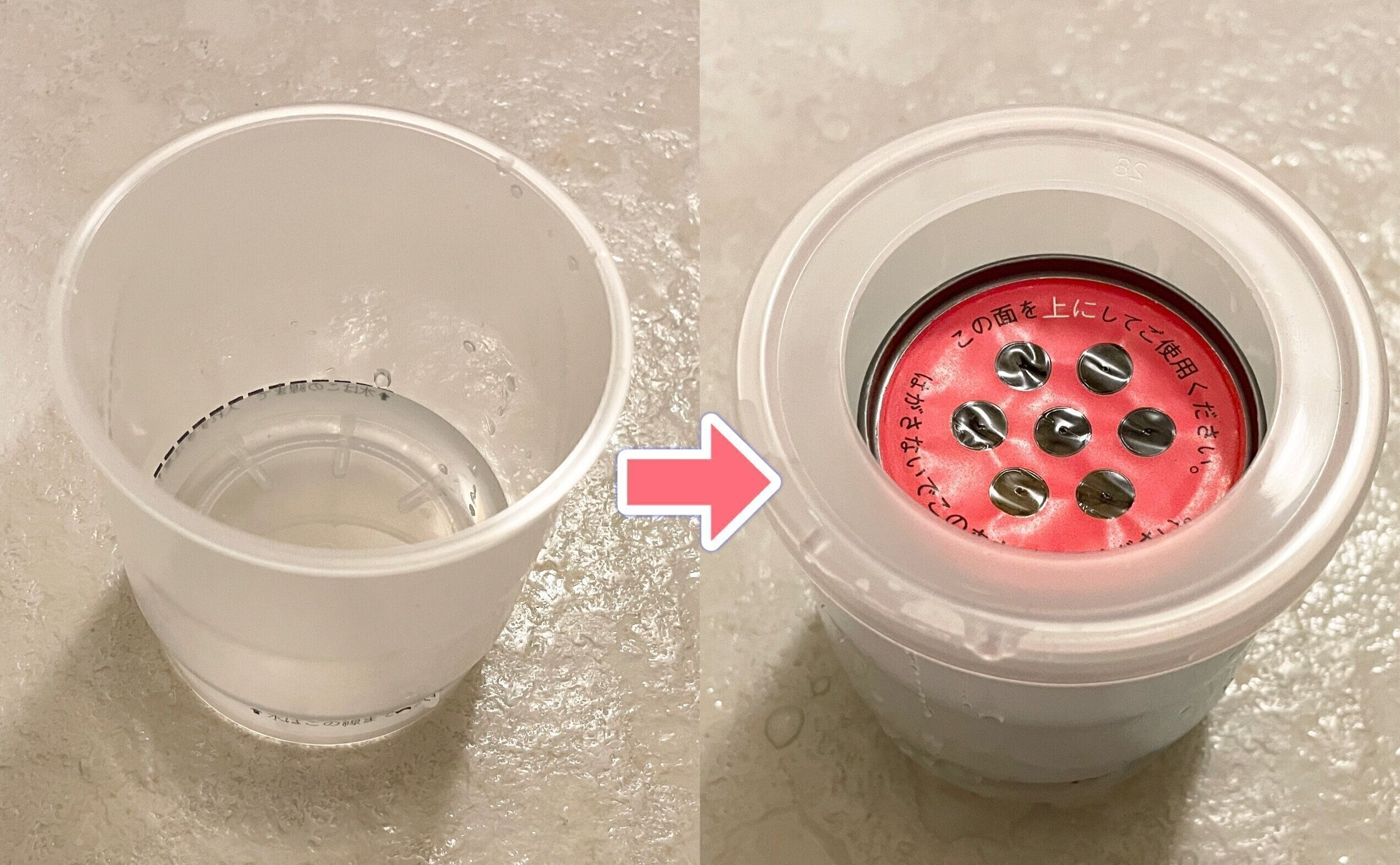 パッケージを開け中身を取り出し、プラスチック容器の点線まで水を入れたら、薬剤缶を入れてリング状のフタをします。約30秒後に煙が出たら浴室から出てドアを閉めてください。