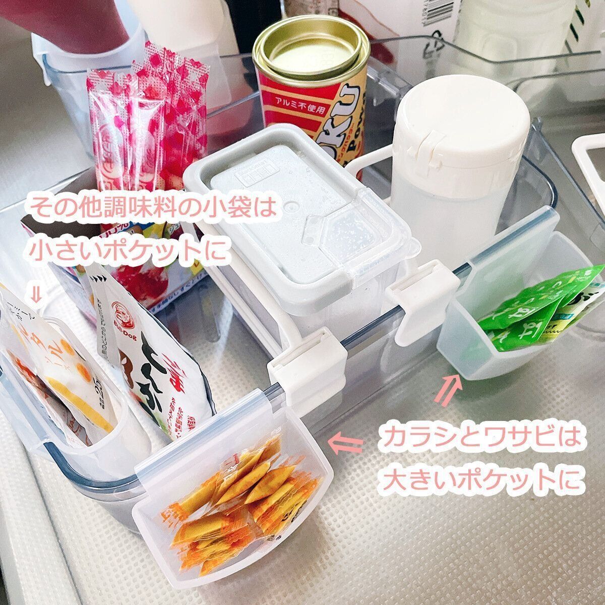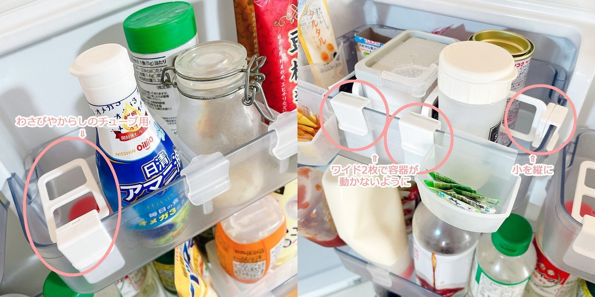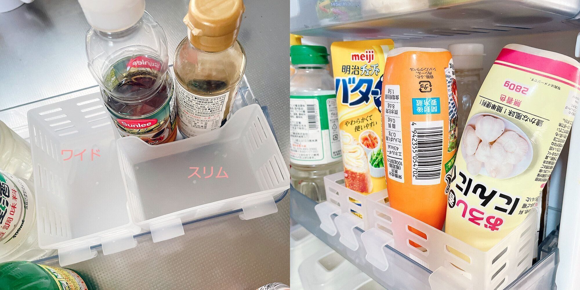 こまかいものも多い冷蔵庫のドアポケットは、そのまま入れてしまうと埋もれてしまったり行方不明になってしまったり、ドアの開け閉めのたびに動いてしまうことも多いです。
