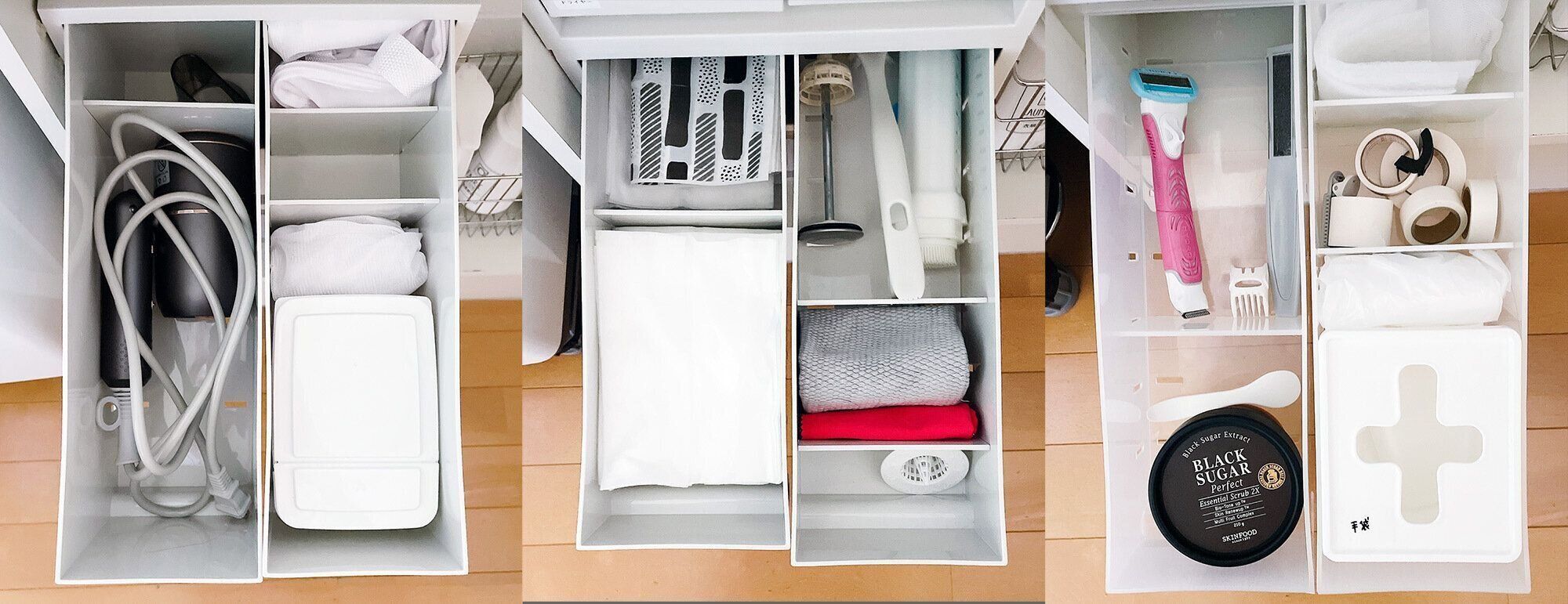 我が家では洗面台下の収納にぴったり入ったので、浅型と深型を組み合わせて引き出し収納にしています。扉を外して、引き出しに変えることができたのでとても便利なんです。