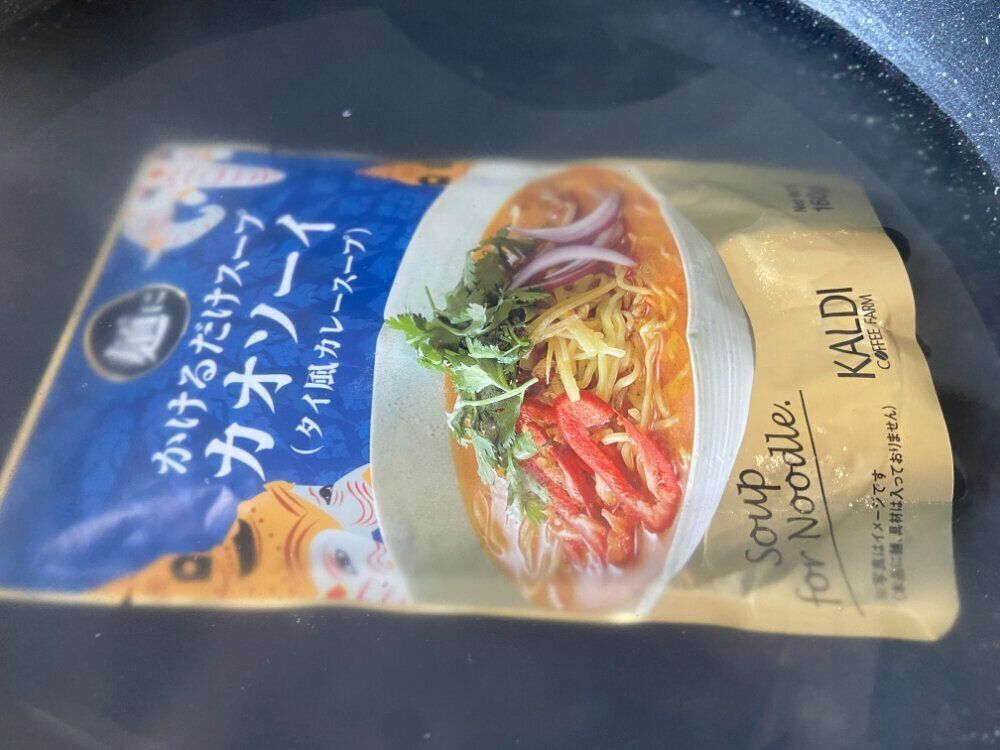 カルディで販売されている麺にかけるだけのカオソーイスープは、一人前のレトルトタイプです。熱湯で5分ほど湯煎してから使います。