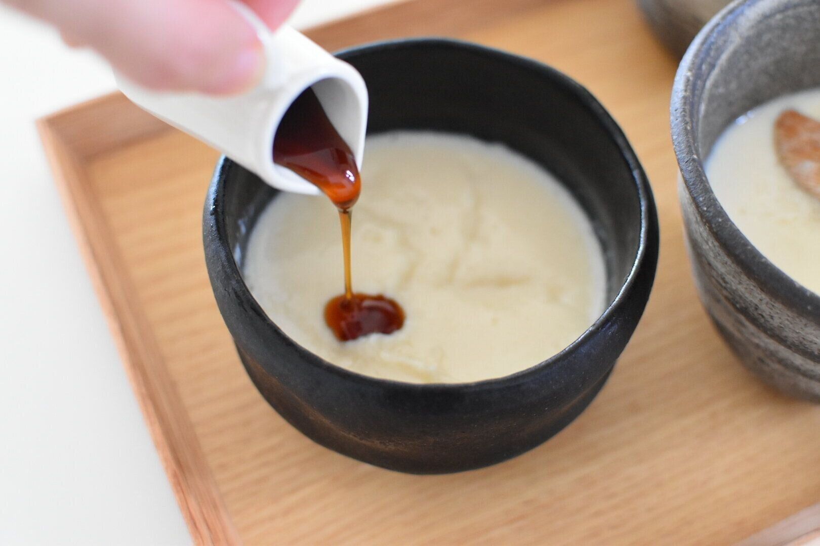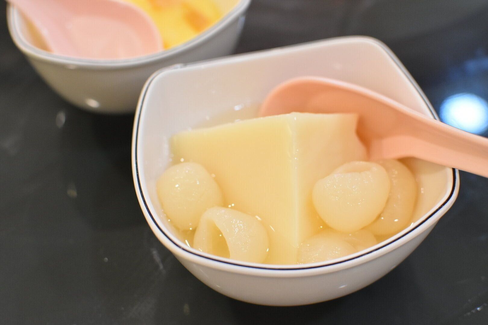 こちらの豆腐花は寒天を使って固めていて、豆乳と相性抜群の黒ごまソースを添えていただきます。