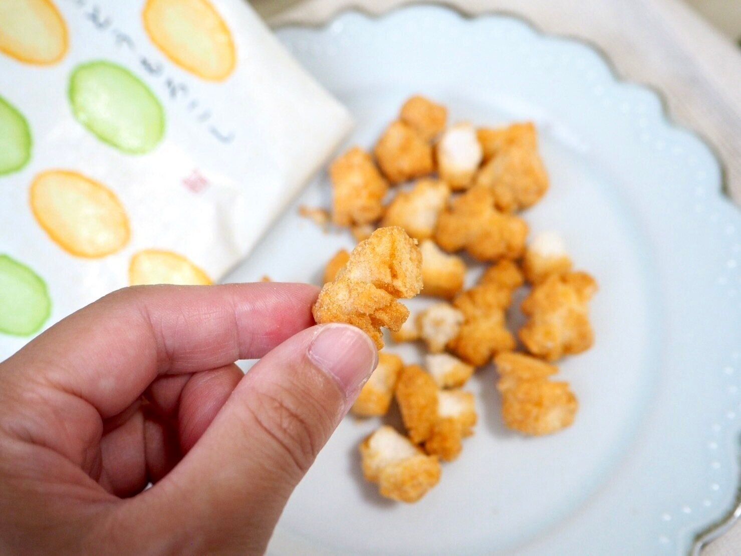 両手のひらにおさまる、おやつタイムにひとりで食べるのにはぴったりな量の揚げ餅が入っています。
