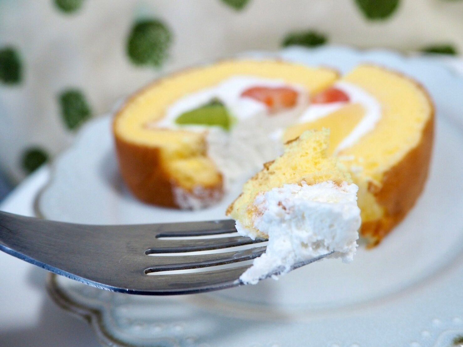 見た目がカラフルな苺、キウイフルーツ、パイナップルのシロップ漬けを、ココナッツクリームで巻いた華やかなロールケーキです。