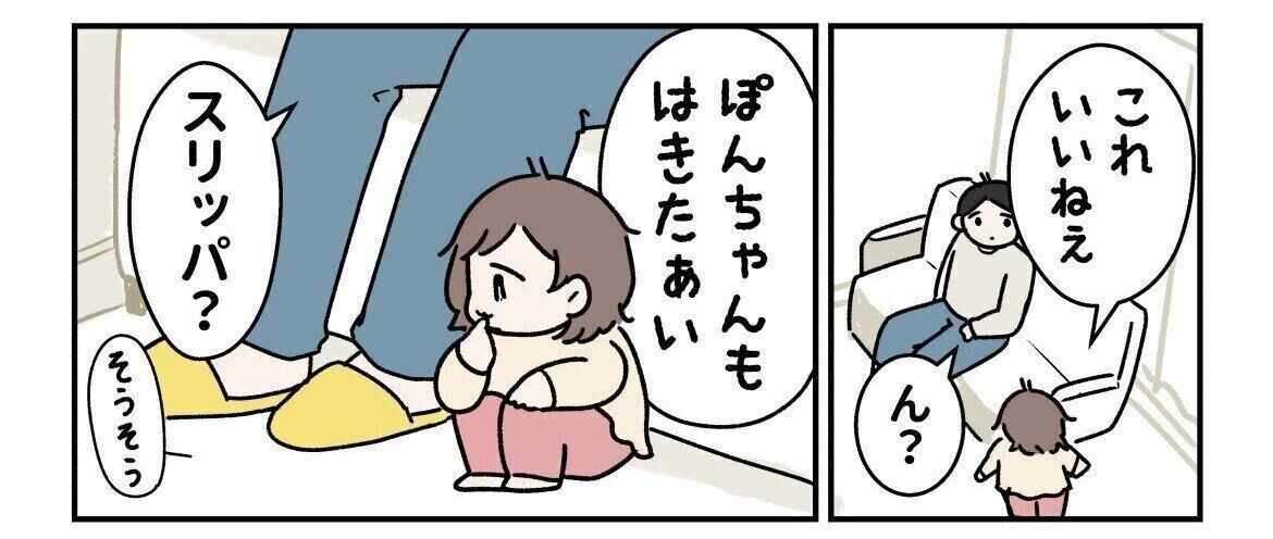 片足だけにスリッパを履き、ぽんちゃんが意気揚々とお家を歩き回る姿は、想像するだけでもかわいすぎます!ママとの「おそろい」で、さらにご機嫌なぽんちゃんにキュンキュンせずにはいられないエピソードでした。