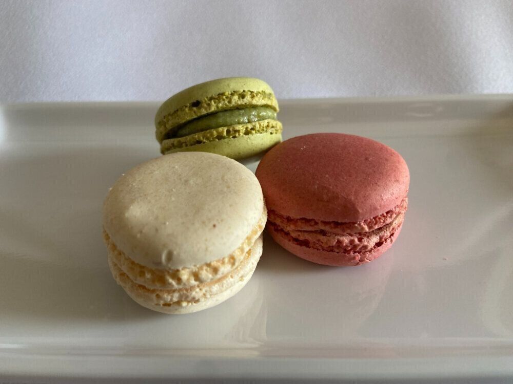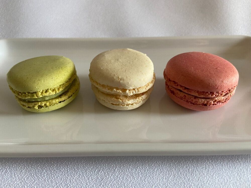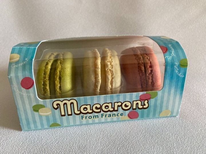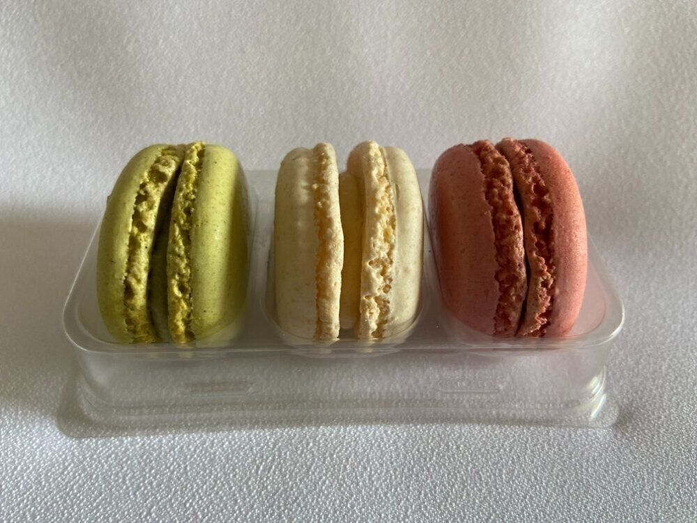 フレーバーは、ピスタチオ、ココナッツ、ラズベリーの3種類。3色のコントラストがとても美しいですね。崩れやすい繊細なお菓子ですが、プラスチックの容器にきちんと収まっていて、崩れや欠けなどはありませんでした。