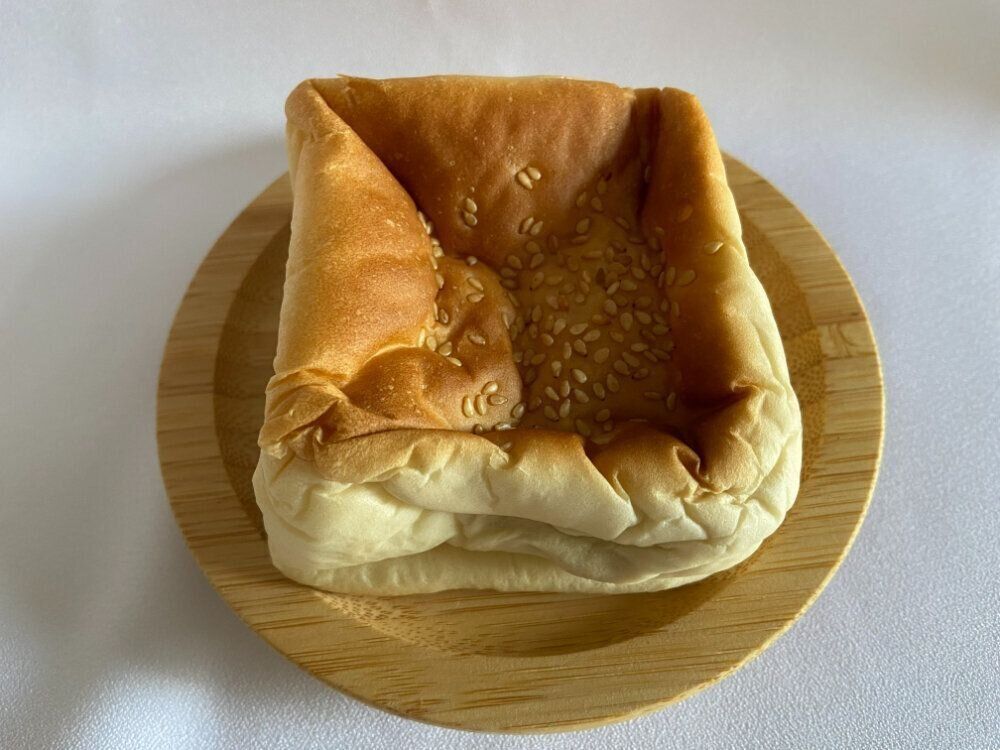 開封してみると、四角くてふんわり柔らかいパンが。表面にはゴマがトッピングされています。