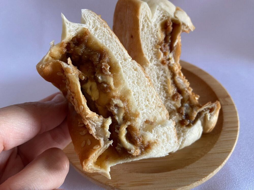 甘辛いしょうが焼きのフィリングが入っていて、ほんのり甘いふんわりしたパン生地とよく合います。思ったよりも軽いので、1個ぺろりとおやつ感覚で食べられるパンです。