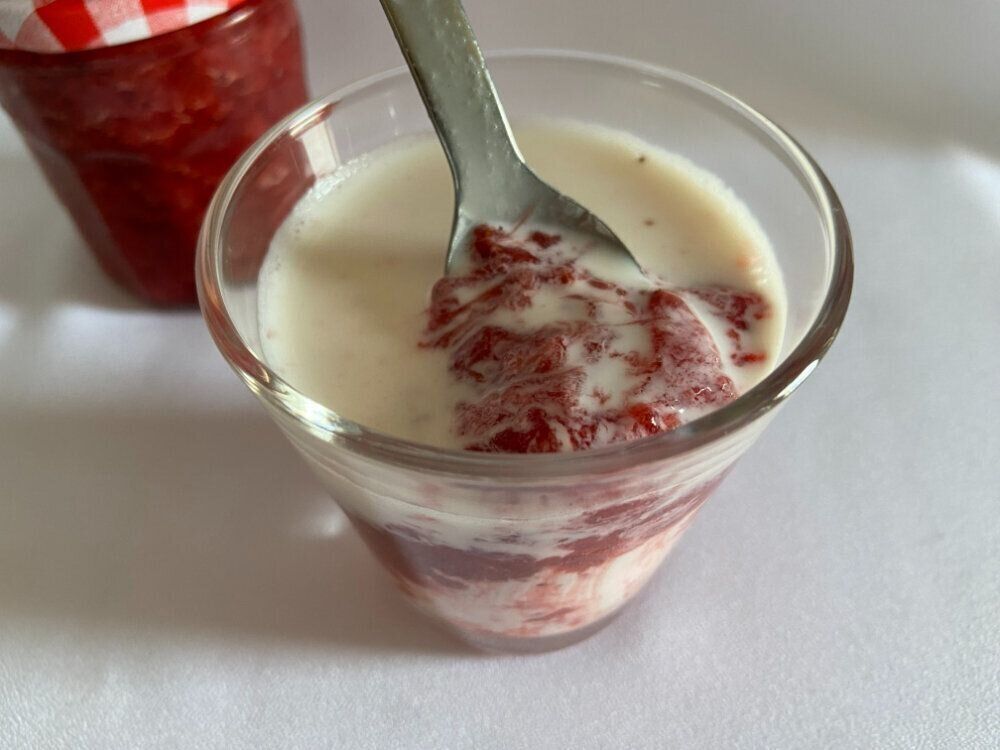 牛乳を注いでよく混ぜて飲んでみると、最高においしい!いちごのフルーティーな甘酸っぱさ、果肉感たっぷりで牛乳のまろやかさとよく合い絶妙なバランスです。昔いちごをつぶして砂糖と牛乳をかけて食べた、なつかしいいちごミルクそのものの味わい。