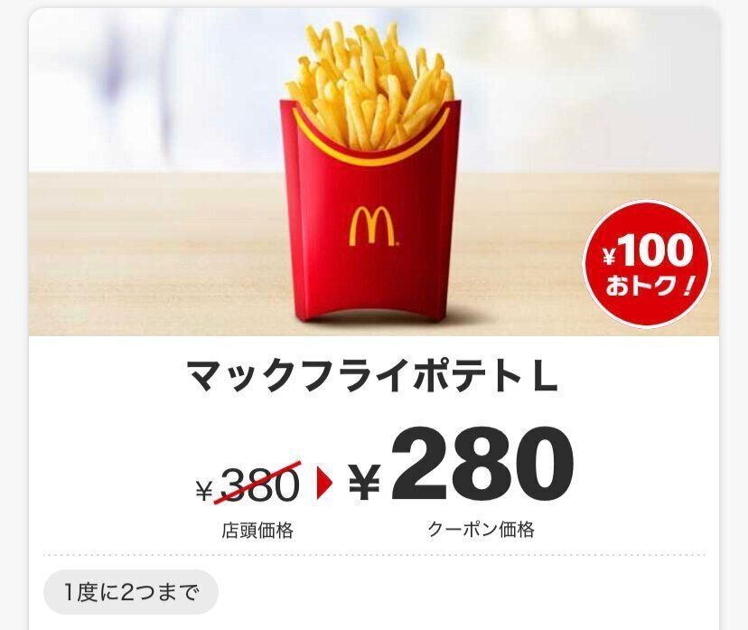 マックフライポテト(R)をお得に購入する方法1つ目はクーポンを利用するという方法。マクドナルドの公式アプリをダウンロードすると、アプリ内でクーポンが発行されているのでチェックしてみましょう。たとえば2023年7月にはマックフライポテト(R)が100円お得な280円で購入出来るクーポンが発行されていましたよ。