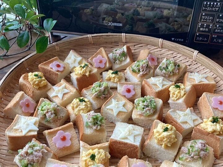 「焼き上がったトーストを、9等分して一口大サイズにし、子どもたちの好きな具材を乗せました。4枚同時に焼けるので、子どもの友だちが遊びに来たときなど、一度にたくさんできるのが助かりました」(えみさん)