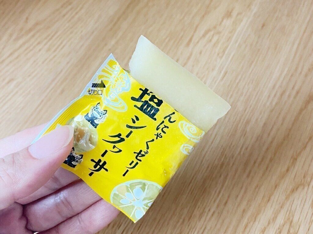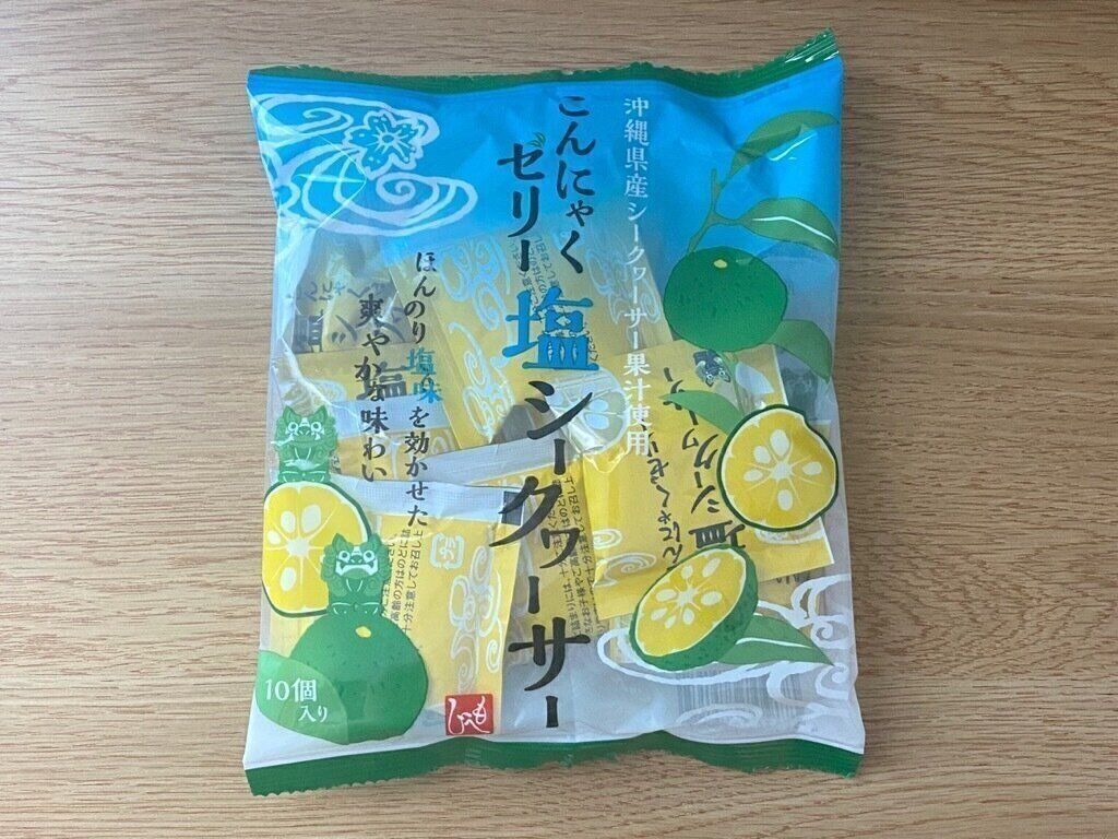 沖縄県産のシークヮーサー果汁にほんのり塩をきかせたこんにゃくゼリーです。1口サイズで食べやすいパッケージになっています。