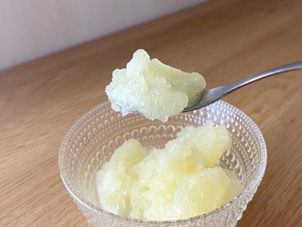パッケージのまま手で押し出して食べられますが、今回はクラッシュして器に盛りつけました。見るからに清涼感があり暑い日にピッタリですね。