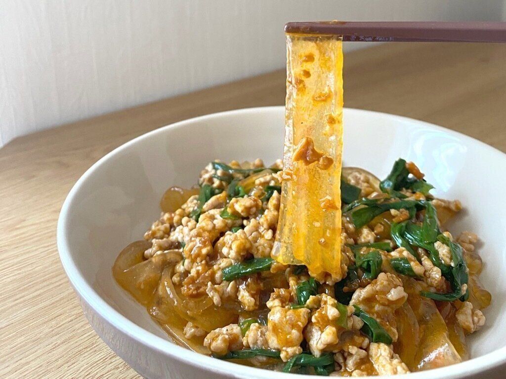 ツルツル、モチモチの麺と甘辛ベースのたれがよく合っていて食欲を掻き立てる味。唐辛子オイルが入っていますが、辛さは控えめなので苦手なかたでも食べやすいです。冷蔵庫にある残り野菜や肉を追加すると立派な1品になりますよ。