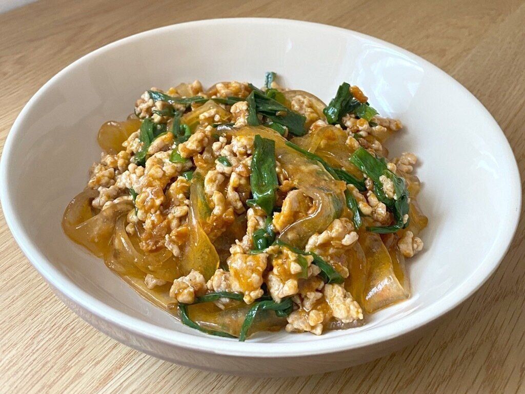 春雨とソースだけでも十分おいしく食べられますが、今回は豚ひき肉とニラを追加しました。