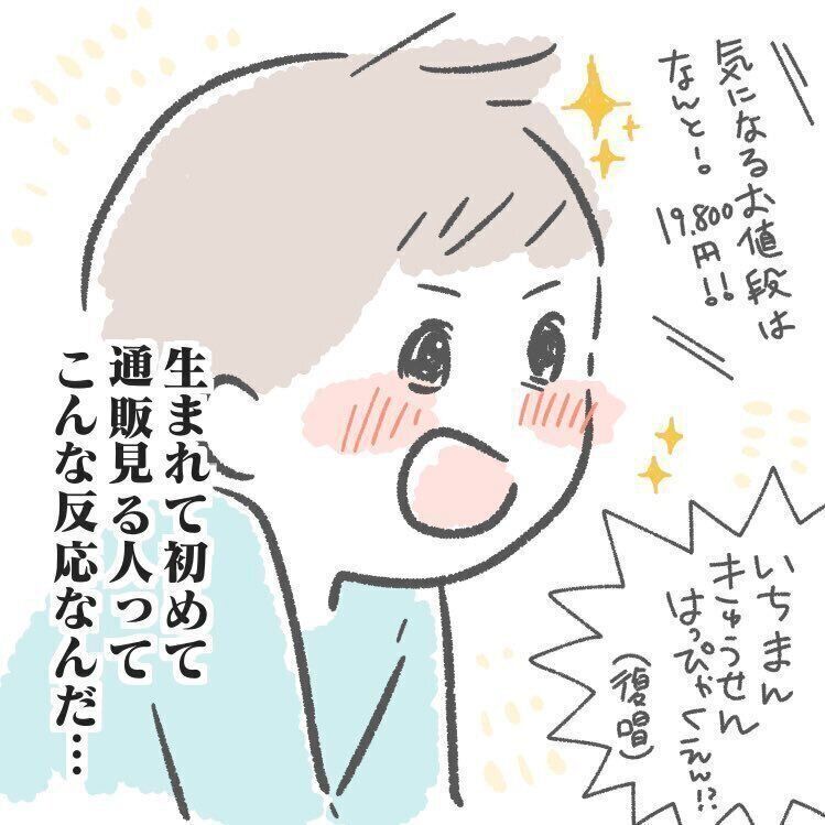 やがて「気になるお値段はなんと!19,800円!!」と価格が発表されると、目を輝かせながら「いちまんきゅうせんはっぴゃくえん!?」と復唱するあーくんを見て、「生まれてはじめて通販見る人って、こんな反応なんだ……」と感心したにいどゆうさんなのでした。