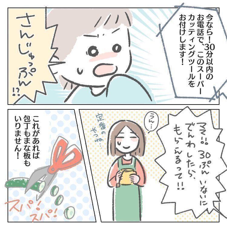 そこにテレビから「今なら!30分以内のお電話で、このスーパーカッティングツールをお付けします!」と、通販番組では定番の呼びかけが聞こえてきました。