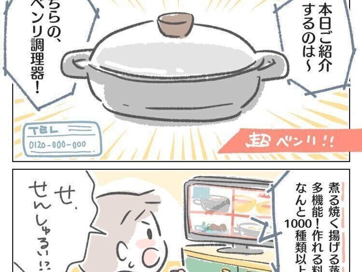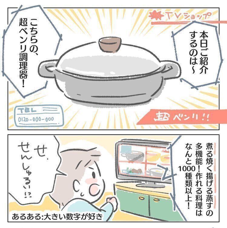 テレビの通販番組を見ているのは、にいどゆうさんの息子さん・あーくん。「つくれる料理はなんと1,000種類以上!」と説明された調理器に、「せ、せんしゅるい!?」と驚きの声をあげています。