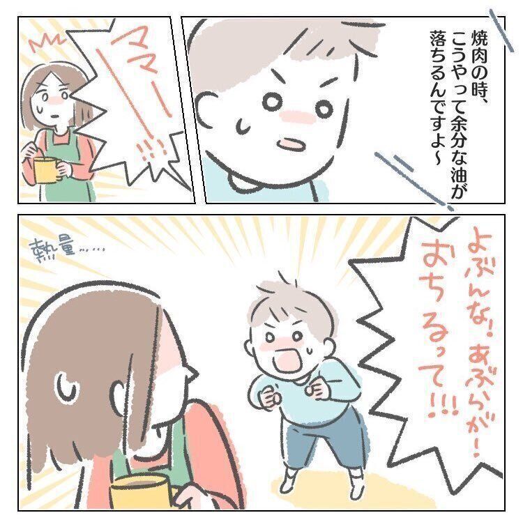 そして「焼肉のとき、こうやって余分な油が落ちるんですよ〜」との説明を聞き、「ママー!!よぶんな!あぶらが!おちるって!!」とさけぶあーくん。その熱心さに、にいどゆうさんもびっくりしています。
