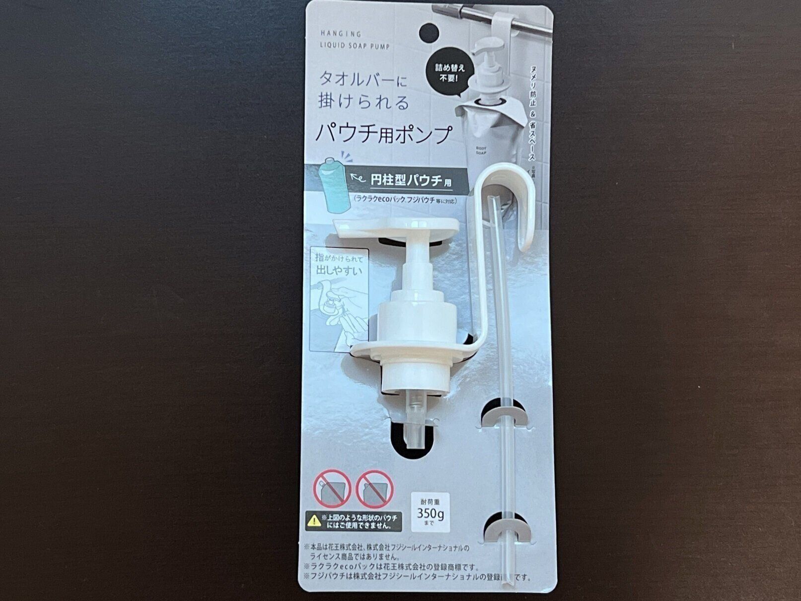 今回ご紹介するのは、セリアで購入した「タオルバーに掛けられる パウチ用ポンプ」です。サイズはポンプ部分が約110×86×奥行52mmで、ストロー部分の長さは約155mm。耐荷重は350gで価格110円となっています。
