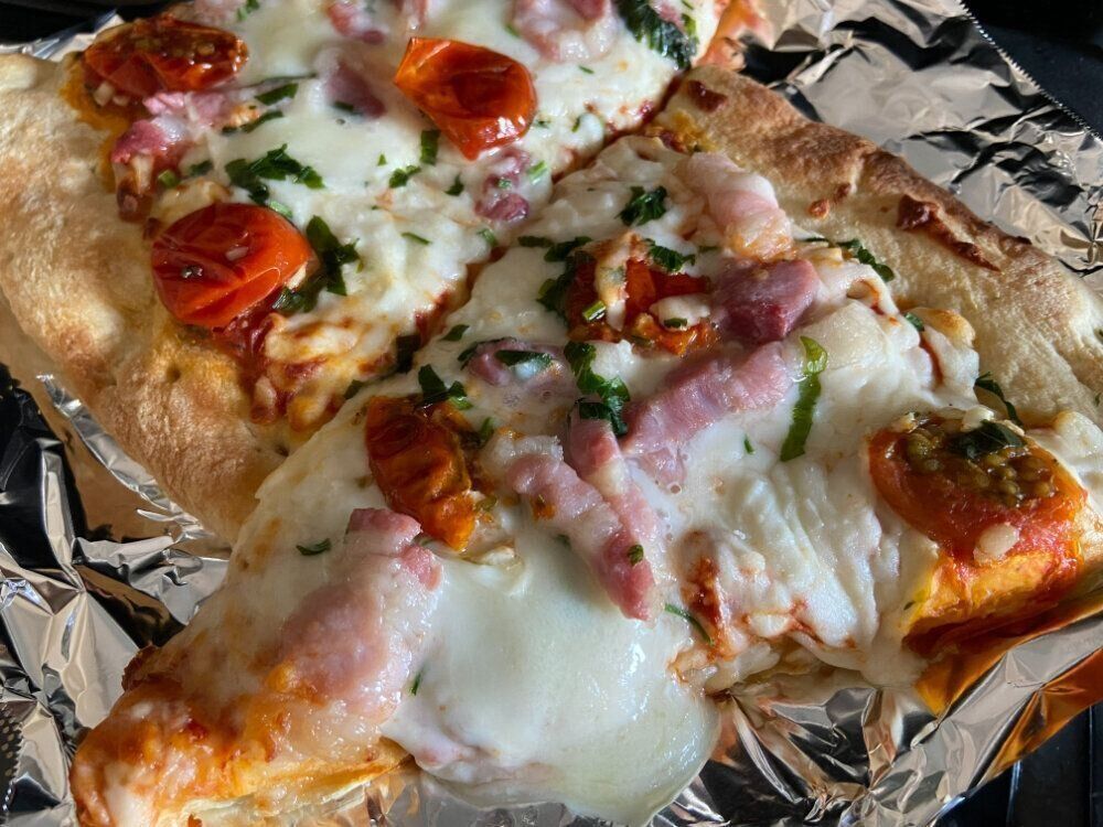 焼きあがったピザからチーズがとろっとはみ出しています!香ばしい良い香りが食欲をそそります。