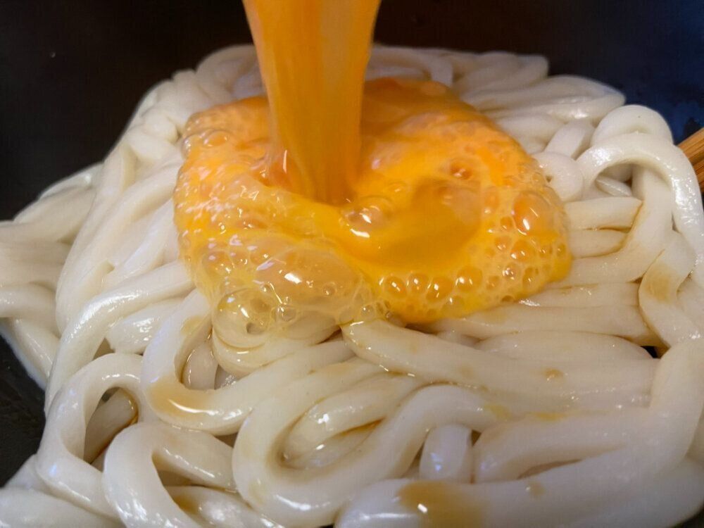 加熱後のうどんに、だし醤油と溶いた卵を加えて手早く混ぜたら完成!あっという間にできあがりました。