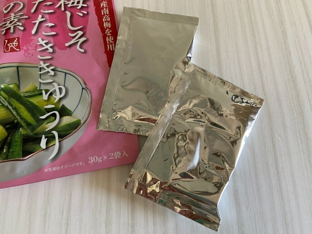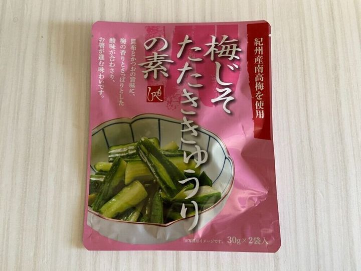 続いては、ピンクのパッケージが売り場でも存在感のあった、「梅じそたたききゅうりの素」(購入時:198円)。