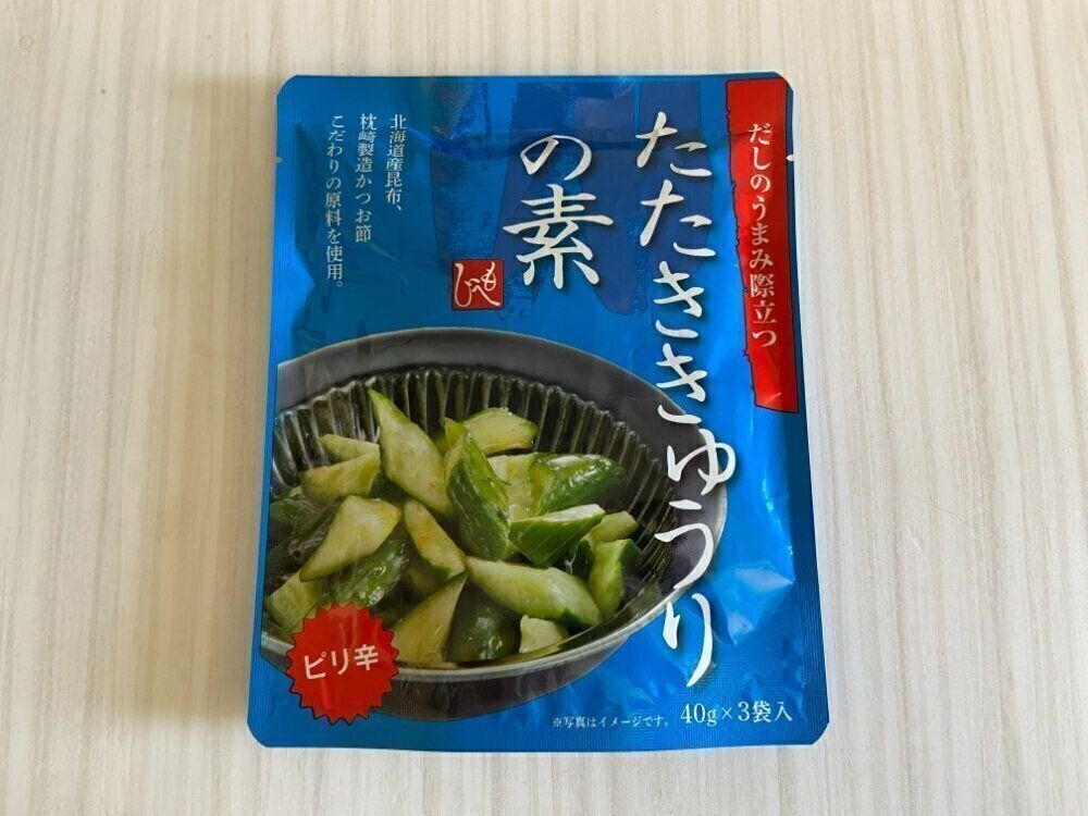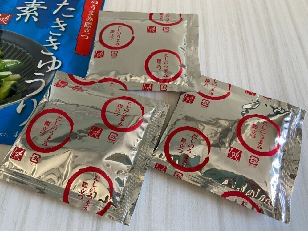 まずはじめに紹介するのは、青いパッケージの「だしのうまみ際立つ たたききゅうりの素」(購入時:198円)。